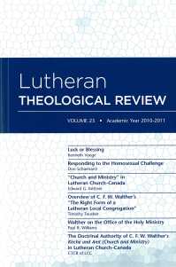 The latest volume of Lutheran Theological Review is now available online. This is the official journal of the two seminaries of Lutheran Church–Canada. The present volume includes essays honouring the 200th anniversary of the birth of C. F. W. Walther, first president of the Lutheran Church–Missouri Synod. Print copies will be mailed to all pastors of LCC, alumni in other countries, and subscribers later this month.