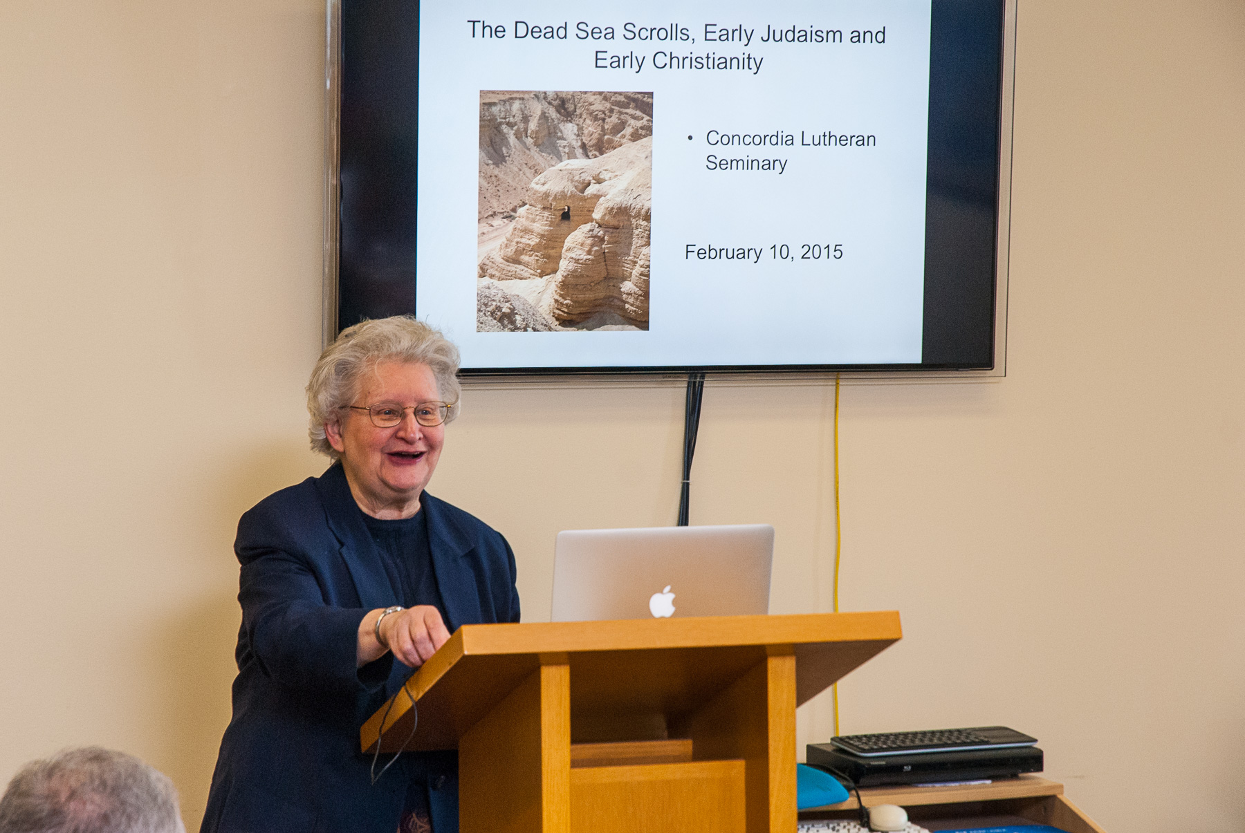 One of the mysteries surrounding the discovery of the Dead Sea Scrolls, explained Sister Eileen Schuller, professor in McMaster University’s Department of Religious Studies, to students, faculty and area clergy in a convocation on 10 February, was that no one really knew what they were or what to do with them. Subsequently, many first ended up in private hands and remained unseen for years, some even appearing in “Miscellaneous for sale” ads in The New York Times! Dr Schuller, recently elected to the Royal Society of Canada, was one of only a few international researchers responsible for the Scrolls’ initial decipherment and publication and is considered Canada’s preeminent scholar of the Dead Sea Scrolls. A lot has changed in how the scrolls are now housed and handled, she explained.