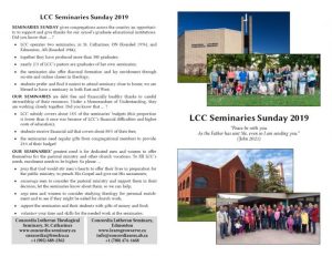 Lutheran Church–Canada no longer designates a specific day “Seminaries Sunday”, but encourages her congregations to remember the two seminaries with prayers and offerings.