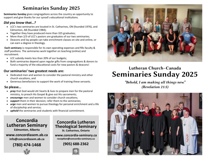 Lutheran Church–Canada does not designate a specific day as “Seminaries Sunday”, but encourages her congregations to remember the two seminaries with prayers and offerings, particularly as the new academic year begins in September.